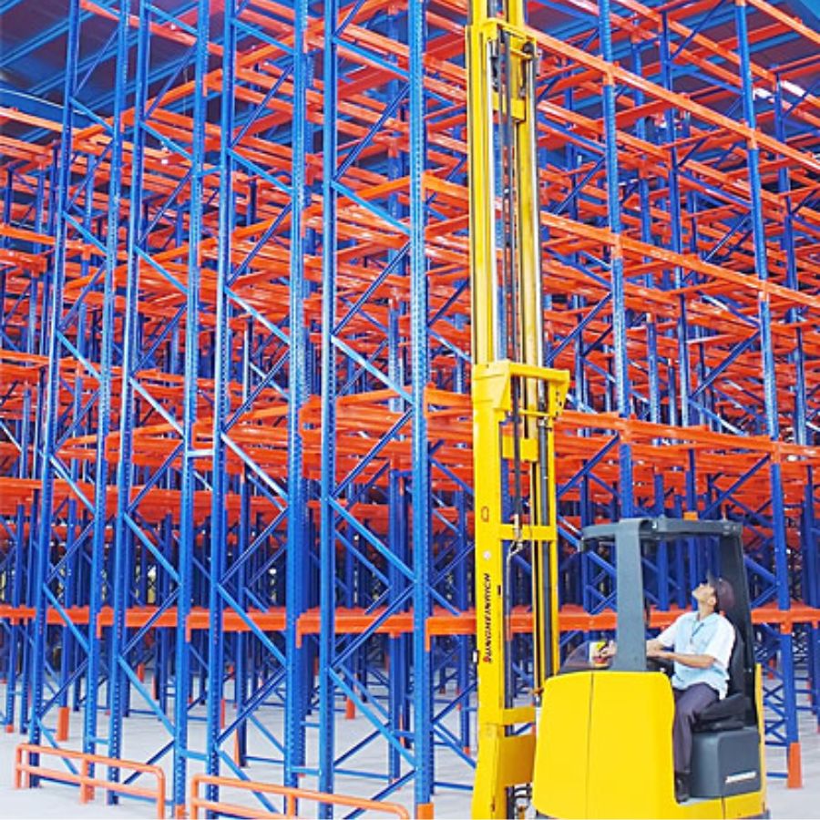 1. Sử Dụng Xe Nâng Chuyên Dụng: Bắt buộc phải sử dụng xe nâng có càng vươn dài (Reach Truck) hoặc xe nâng được trang bị bộ càng Double Deep để tiếp cận và lấy pallet hàng hóa nằm sâu bên trong.